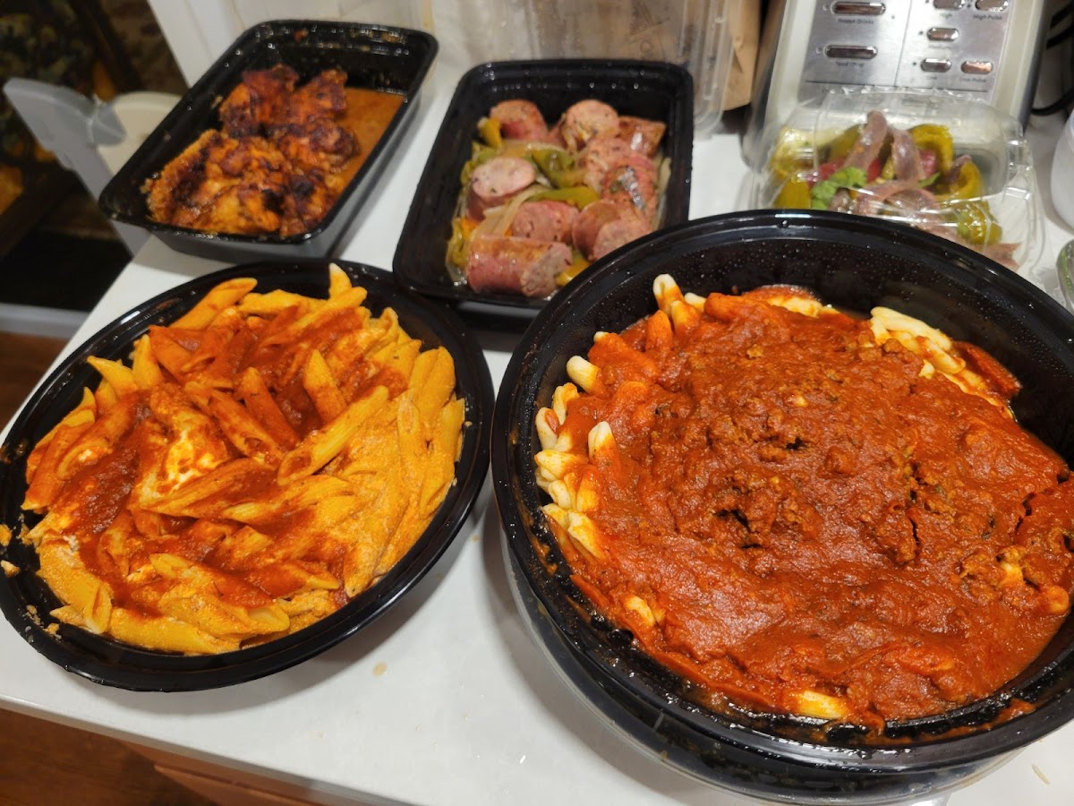 Grilled Salmon and Eggplant Parmesan with a Side of Spaghetti Warm Bread with Butter